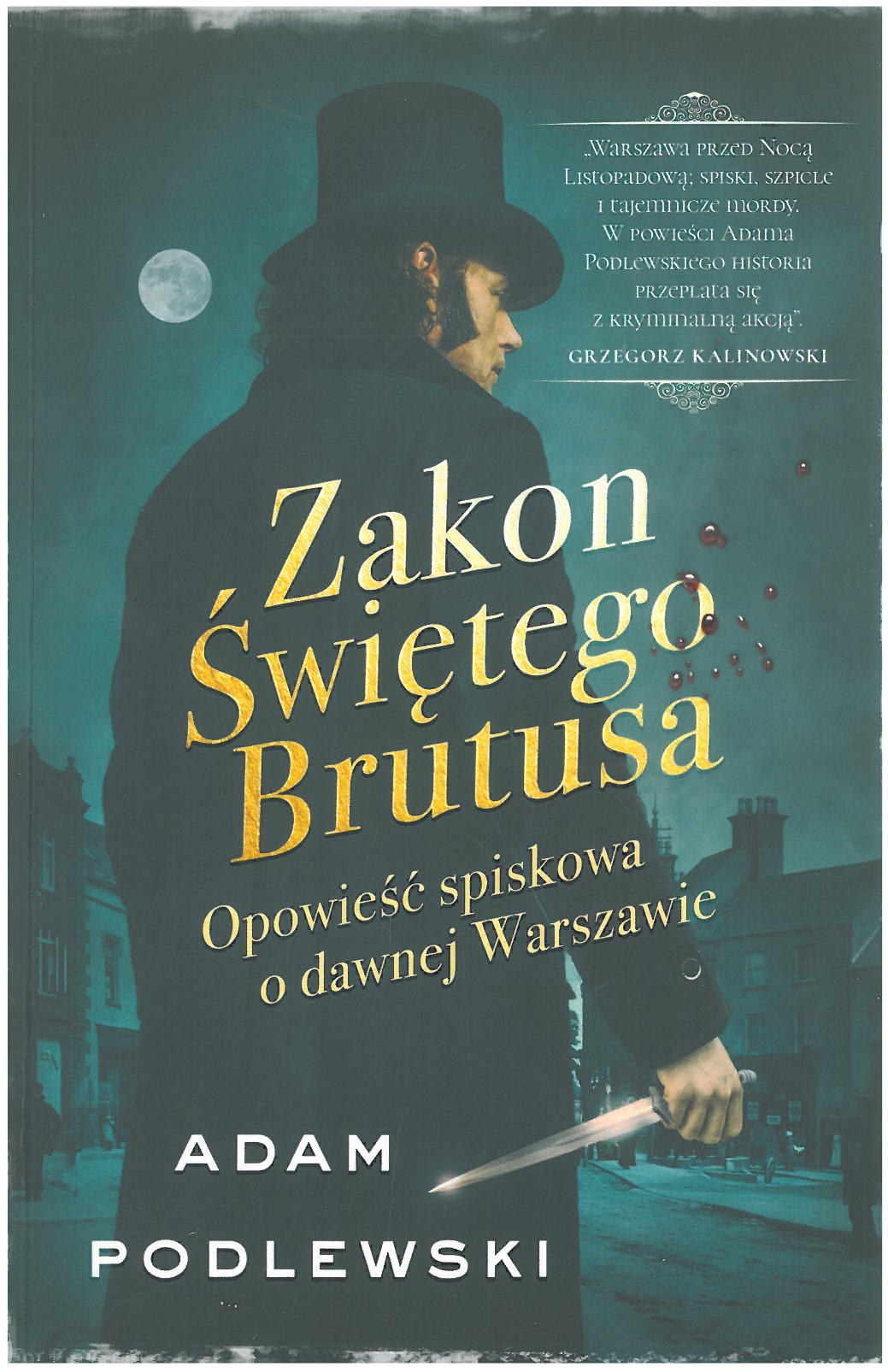 Na okładce: "Warszawa przed Nocą Listopadową: spiski, szpicle i tajemnicze mordy. W powieści Adama Podlewskiego historia przeplata się z kryminalną akcją". Grzegorz Kalinowski.