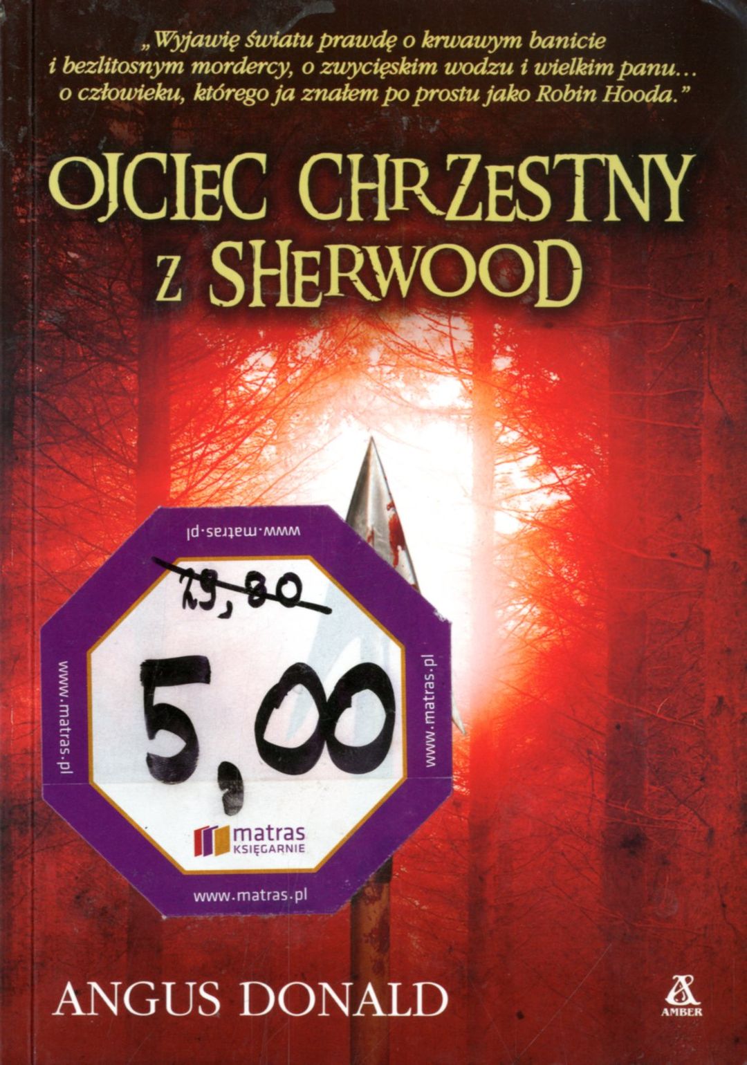 "Wyjawię światu prawdę o krwawym banicie i bezlitosnym mordercy, o zwycięskim wodzu i wielkim panu... o człowieku, którego ja znałem po prostu jako Robin Hooda". Anglia, wiek XII. Król walczy z synem o tron, krajem rządzą szeryfowie, którzy gnębią lud podatkami, a sędziwy Alan z Nottingham spisuje historię swojej młodości - dni życia poza prawem, kiedy nie bał się ludzi króla ani szeryfa, kiedy robił, co chciał, brał, co chciał i nie przestrzegał żadnego prawa poza prawem ustanowionym przez jego pana Robina, władcę Sherwood. Jego kronika odsłania zupełnie inne dzieje Robin Hooda niż opiewane w pieśniach i wychwalane na kartach Annałów... W 2010 roku na ekrany kin wejdzie film Ridleya Scotta pt. "Robin Hood" - w roli głównej Russell Crowe. "»Ojciec chrzestny z Sherwood« rwie do przodu jak szarżujący rumak bojowy i chwyta cię jak średniowieczne narzędzie tortur. Styl wspaniały, znajomość faktów imponująca, fabuła wciągająca od pierwszej do ostatniej strony. Angus Donald sprawił, że nasz ulubiony banita stał się o wiele bardziej interesujący, a las Sherwood - o wiele bardziej mroczny". Nelson DeMille Angus Donald, brytyjski dziennikarz, debiutuje pełną okrucieństwa powieścią, w której przedstawia zupełnie nową wersję legendy o "księciu złodziei". źródło opisu: [Amber, 2009]
